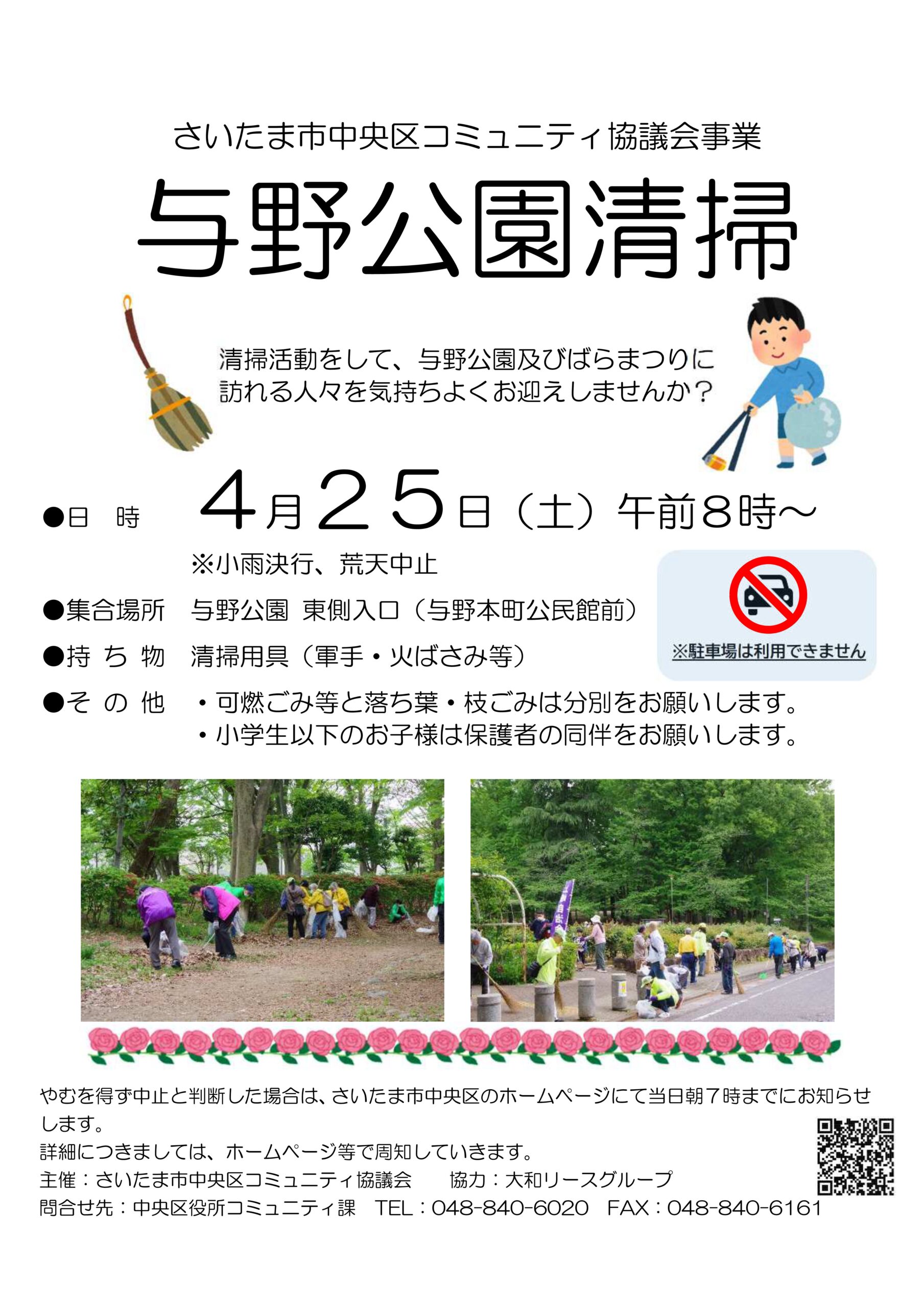 与野公園 清掃活動のお知らせ 2026 3/13 公園からのお知らせ 2026.03.23 4月25日(土)午前8時~ 与野公園清掃活動を実施します。 与野本町公民館前にご集合ください。 軍手・火ばさみ等をご持参ください。 公園からのお知らせ よかったらシェアしてね! URLをコピーしました! URLをコピーしました! かけっこ教室 中止のお知らせ
