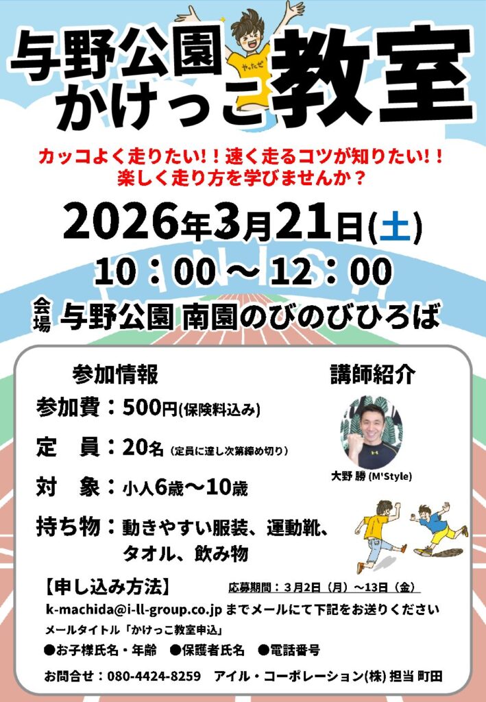 3月21日(土)10:00~ 速く走るコツを楽しく学んでみませんか? 応募はメール:k-machida@i-ll-group.co.jp まで 定員先着20名様 -